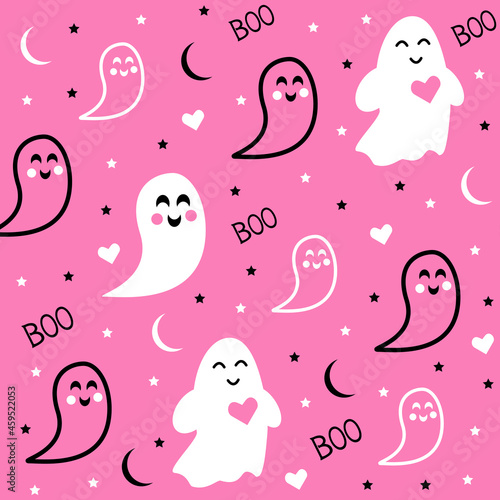 Cute Pink Halloween Ghost Girl with Bow Vector Illustration
