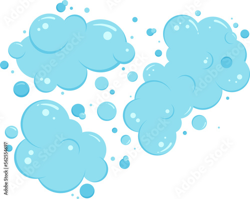Soap foam set with bubbles. Carton light blue suds of bath water, shampoo, shaving, mousse. Vector illustration isolated on white background.