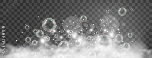 Soap bubbles, shampoo or bath foam, lather suds in water. Flying in air transparent aqua glass spheres. Realistic laundry powder detergent or washing gel