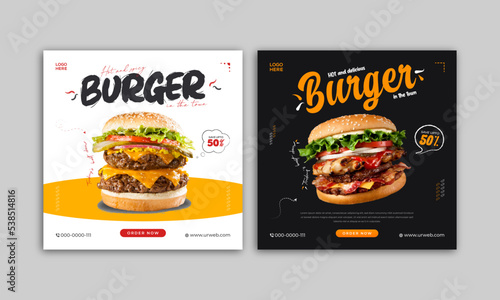 Food social media banner design template. Burger social media post vector illustration. Square size.