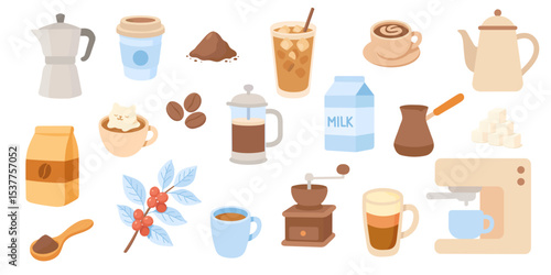 Collection of coffee illustrations and icons. Cafe and coffeeshop design. Concept characters with coffee mugs and utensils. Modern minimalist flat art. Perfect for coffee stores, prints, stickers.