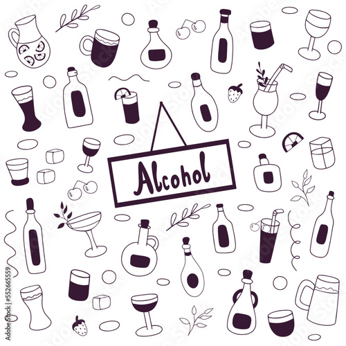 Alcohol doodle set. Collection of hand drawn sketches templates of alcoholic beverages. Template for wrapper or menu