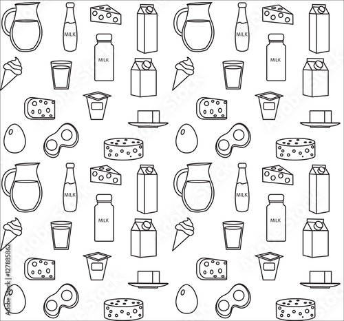 Dairy product seamless pattern. Modern, line, outline style. Milk products background. Milk and Cheese texture. Farm Foods endless backdrop. Vector illustration