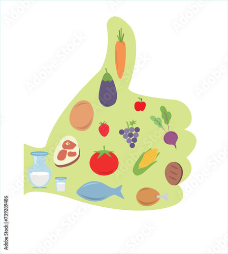 Healthy food set. Vegetables, fruits, milk, mushrooms and fish collection. Natural organic nutrition. Fresh vitamin grocery products. Colored flat vector illustration isolated on white background
