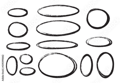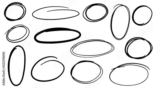 Ellipse pencil doodles for highlights. Black pen oval sketches. Marker circle doodles. Set of hand drawn horizontal circles isolated on white background. Realistic vector