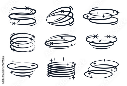 Retro stars, starburst icons and minimalist frames with twinkle star. Y2k geometric shape. Abstract stars orbit, minimalistic and simple Circle design element with stars.