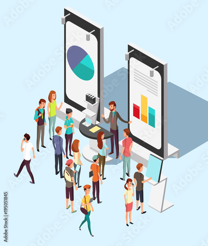 People crowd at exhibition trading promotion stand in exhibition. Market retail isometric vector concept