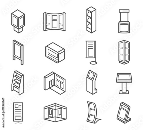 Advertising Exhibition Banner Stands, Display Vector Line Icons Set. Roll-up Poster, Billboard, Fair Desk And Concave Wall. Editable Stroke. 48x48 Pixel Perfect.