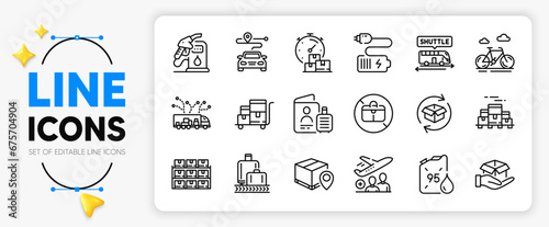 Set of Filling station, Delivery calendar and Parking line icons for web app. Design elements, Social media icons. Lighthouse, Electric bike, Map icons. Vector