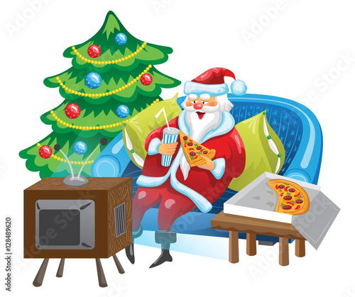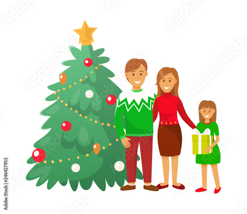 Christmas celebration winter holiday people at home vector. Pine tree plant with baubles and star, shining garlands and family mother and father couple