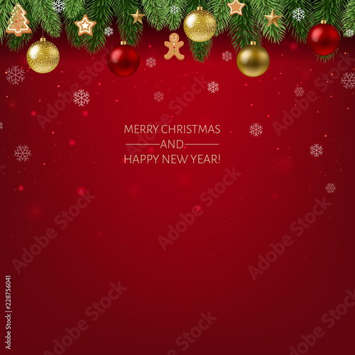 Christmas Border With Fir Tree Red Background With Gradient Mesh, Vector Illustration