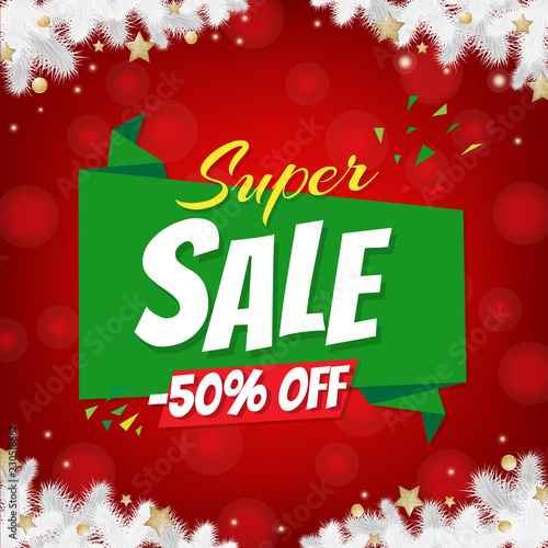 Christmas sale vector, wreath made of pine tree branches. Xmas symbol composition of spruce and baubles. Red ribbons and golden garlands bulbs with sweets. Traditional candy stick and star toy