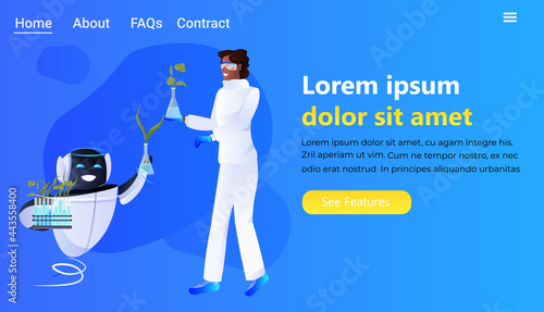 african american scientist with robot holding test tubes with genetically modified plants scientific research