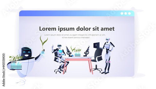 modern robots holding test tubes with genetically modified plants scientific research artificial intelligence technology