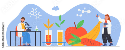Scientists studying genetically modified food in laboratory. Man and woman conducting scientific research using equipment flat vector illustration. Biology, technology, agriculture concept for banner