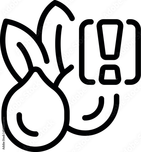Line art icon of genetically modified onion with exclamation point warning sign representing potential health risks and ethical concerns