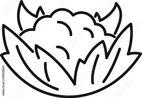 Line drawing of a genetically modified cauliflower with devil horns growing in a garden