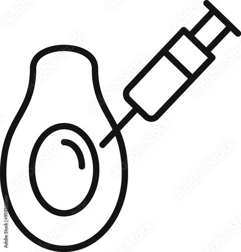Line icon of a syringe injecting a chemical substance into an avocado, representing the concept of genetically modified food