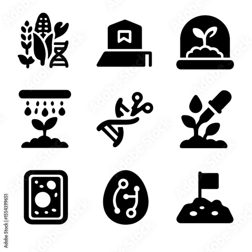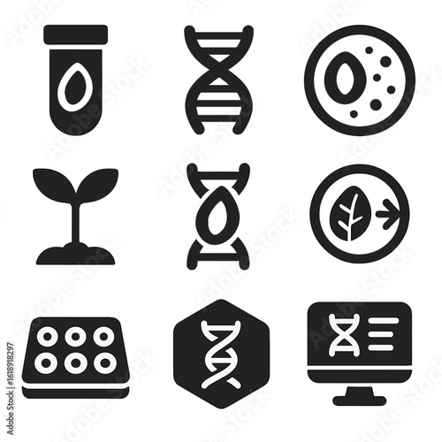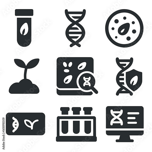 Genetic Seed Icon Set. Solid, filled icons set of genetically enhanced seed development: seed vial, genome
