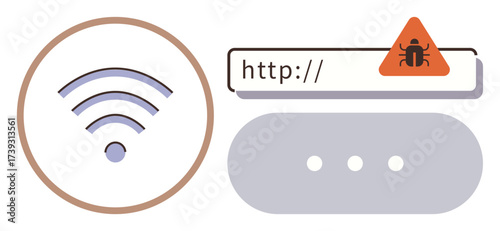 Magnifying glass examining a URL bar with malware warning icon. Cloud in background. Ideal for cybersecurity, online safety, malware alert, internet search, data protection, hacking phishing. A