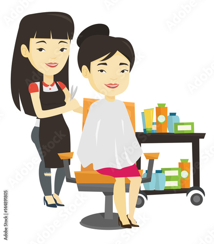 Master hairdresser cuts hair. A client is getting a haircut by a stylist. Work in a beauty salon. Flat illustration. Eps10