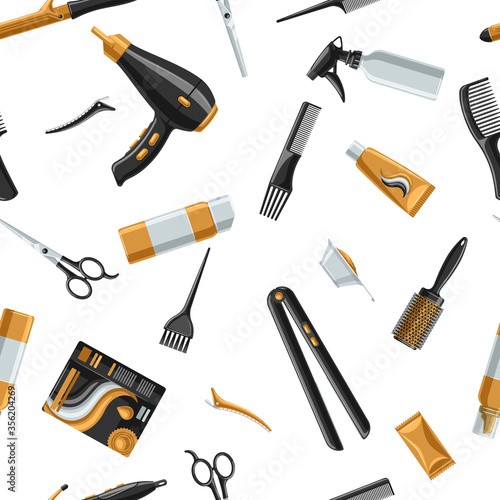 seamless hairdressing tools pattern: hair dryer, hair spray, clipper, comb, scissors, clip and bobby pins- vector illustration