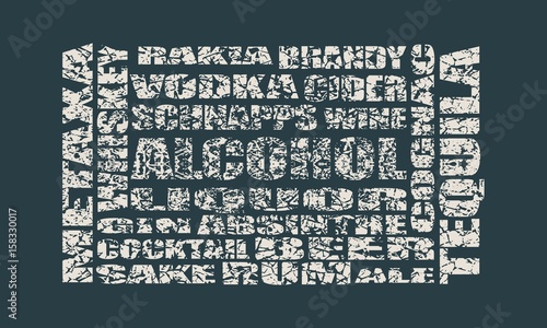 Different drinks list. Drink alcohol beverage. Relative words cloud. Grunge cracked texture