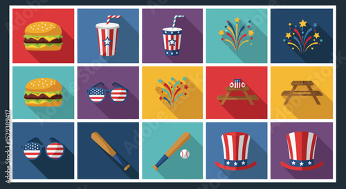 Hello Summer. Set of summer icons with swimsuit, cocktail, umbrella, balon, hat and slippers. Vector images in flat style