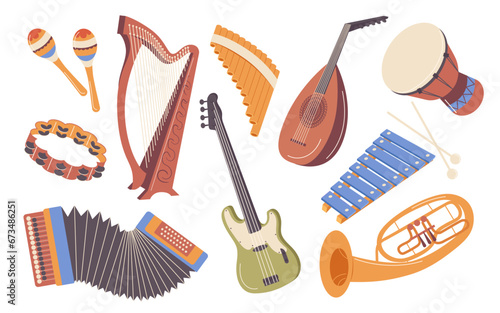 Pictures of different musical instruments with names. Set of musical instruments in thin line.