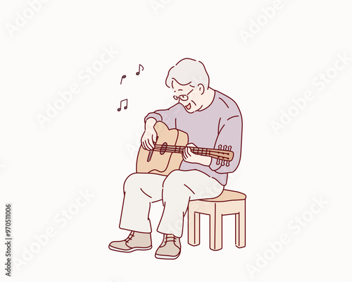 senior man with acoustic instrumental guitar. Man playing guitar. Hand drawn style vector design illustrations.