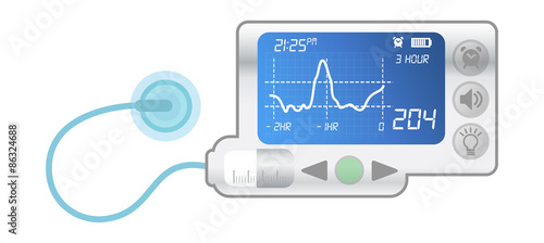 Isometric vector illustration of insulin pump, reservoire and catheter.