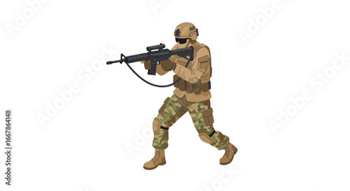 Military soldiers in camouflage uniform running and aiming rifles in tactical formation