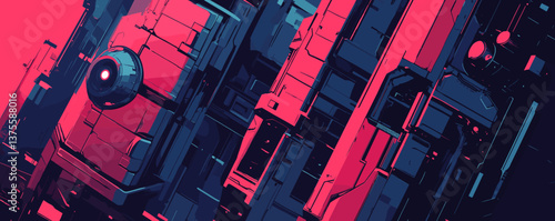 Layers of mechanized platforms with gauges, caution strips, and electric signals. Ideal for technology, safety, automation, energy, engineering, equipment simple flat metaphor