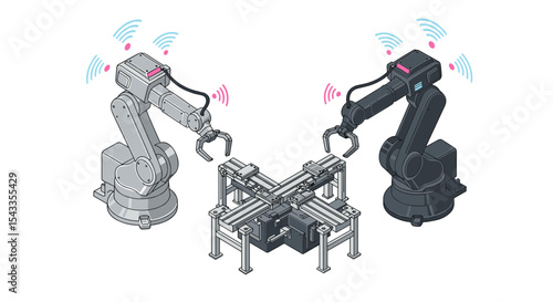 Robotic arms in industrial automation concept with wireless connectivity for innovative manufacturing solutions isometric style vector illustration
