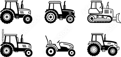 Farming vehicles icon set. Agricultural machines silhouette on white. Vector illustration