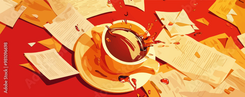 Develop an illustration of a spilled coffee cup on important documents, signifying a mishap in a workplace setting. Vector flat minimalistic isolated illustratio