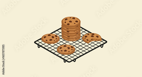 Wholewheat biscuit with chocolate, oatmeal crumbs flying, isolated on white, cookie top view, vector illustration, snack, healthy food, organic bakery item.
