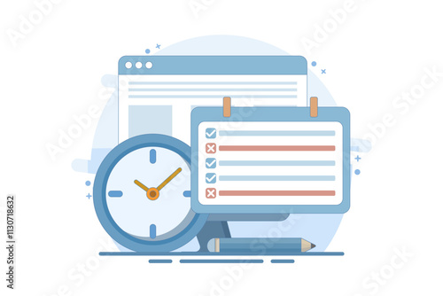 Time management icon with clipboard and clock. Schedule, deadline, and task list concept. Project planning and organization symbol. Minimalistic linear vector illustration.
