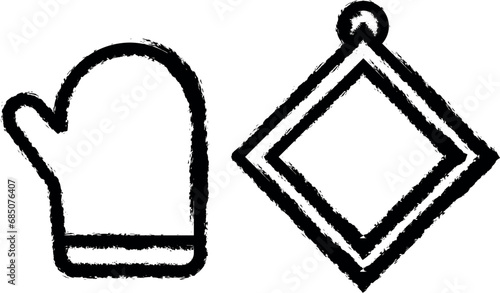 Kitchen oven mitt and pot holder. Heat resistant oven glove. Hand-drawn illustration on white background. Doodle style.