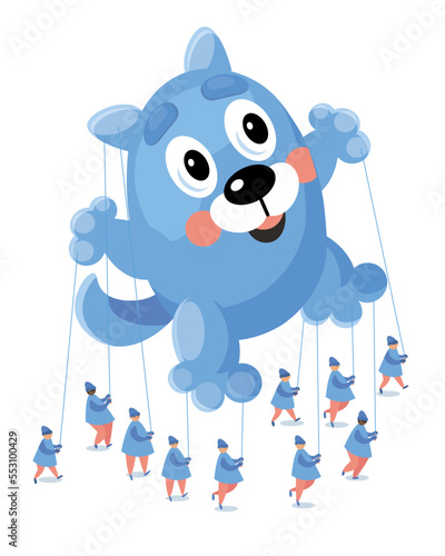 Set of cartoon characters for parade scene in city. Cute dog balloon, crowd of happy people, orchestra, drummers and flute players. Holiday, carnival. Vector illustration.