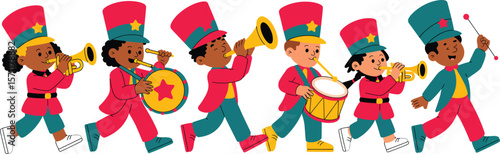 Parade of cute band of marching kids in uniform set, girls and boys play festival music