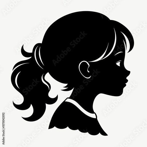 Striking silhouette profile of a young girl's face is captured against a light background, highlighting her ponytail and features. The monochrome image evokes a sense of mystery and simplicity