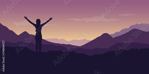 happy girl with raised arms at beautiful purple mountain nature landscape vector illustration EPS10