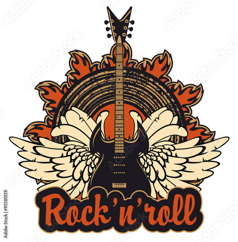 Rock and roll poster template. Winged guitar on grunge background. Design element for logo, emblem, card,banner, t-shirt. Vector illustration