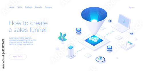 Isometric online funnel generation sales, customer generation, digital marketing and e-business technology concept. Landing page template for web. Internet marketing vector illustration