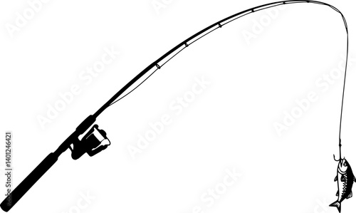 Color image of cartoon fishing rod with big fish on white background. Hobby and fishery. Vector illustration.