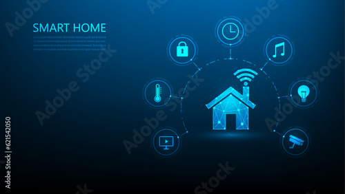 smart home internet of things on blue dark background. home control system and technology icons. house control device. vector illustration fantastic hi tech design. iot automation concept.