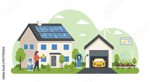 Sustainable energy smart home with solar panels and energy management system vector illustration