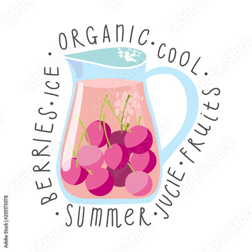 Juice with berry in a glass jug, vector cartoon card with fresh berries and smothie isolated on black.