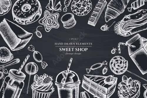 Design with chalk cinnamon, macaron, lollipop, bar, candies, oranges, buns and bread, croissants and bread, strawberry, milk boxes, smoothie cup, lollipop, smothie jars, cheesecake, eclair, cupcake